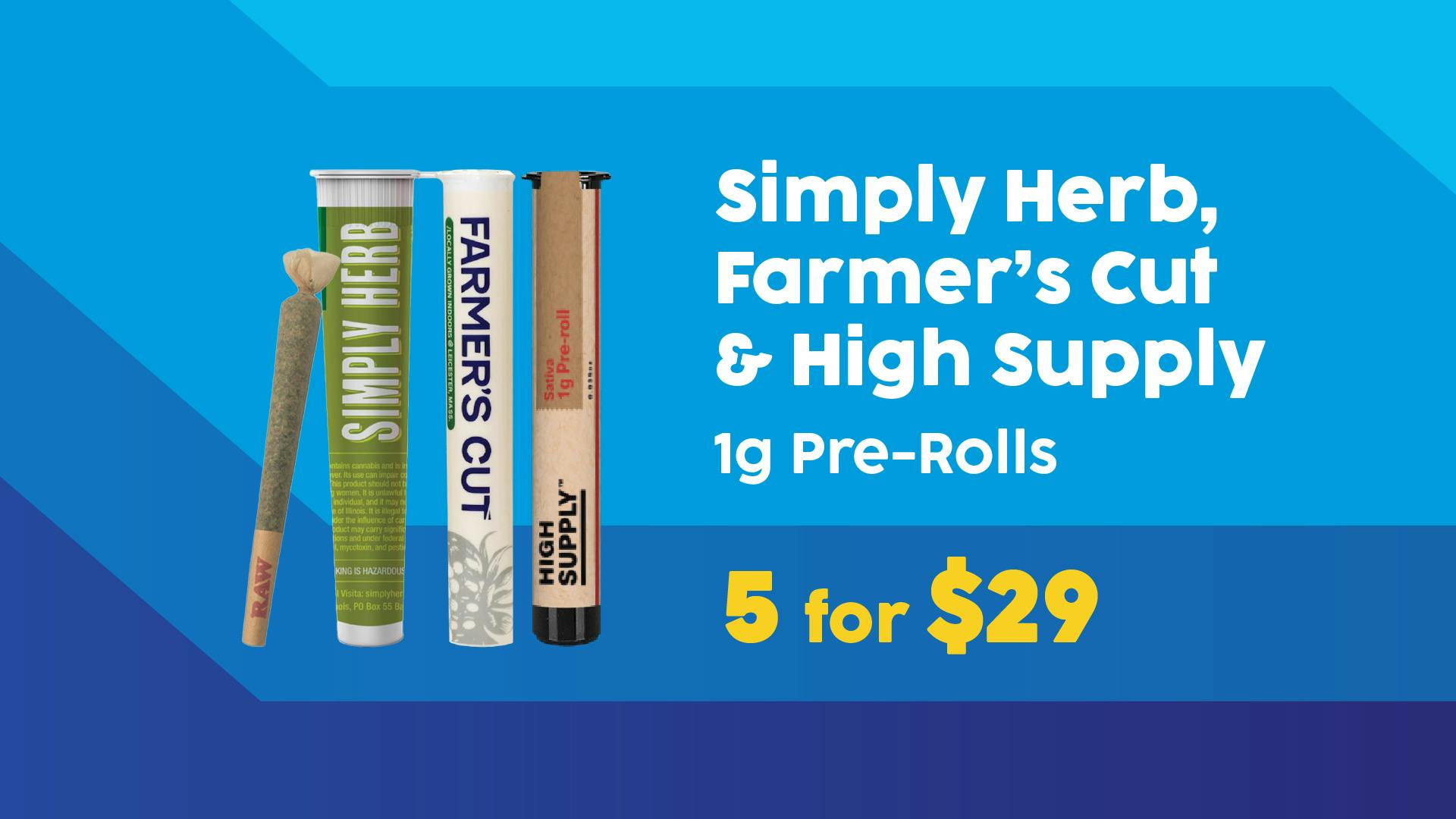 Home / Specials / 5 for $29 High Supply, Farmer’s Cut & Simply Herb 1g Pre-Rolls!